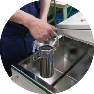 洗浄の第一工程で除去しきれなかった切粉と油を取り除くため、ろ過装置で常にきれいな洗浄溶液が保たれる装置でさらに洗浄。この中で細やかに部品を踊らせることで、切粉と油を徹底的に除去します。