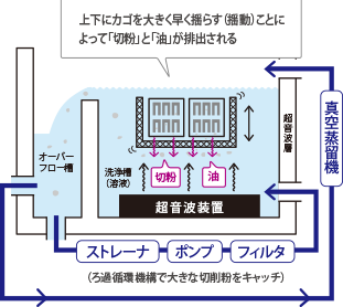 (真空蒸留機で洗浄溶液と加工油を分離し、きれいになった洗浄溶液を洗浄層へ戻す)